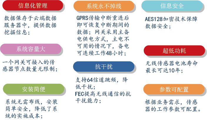 本方案對供暖系統中各點進行實時溫度監測,實現了供暖系統的溫濕度監測智能化、信息化。居民室內安裝無線溫度傳感器,周期性采集環境溫度數據并上報到網關,再由網關通過GPRS或CDMA方式上傳至互聯網中的